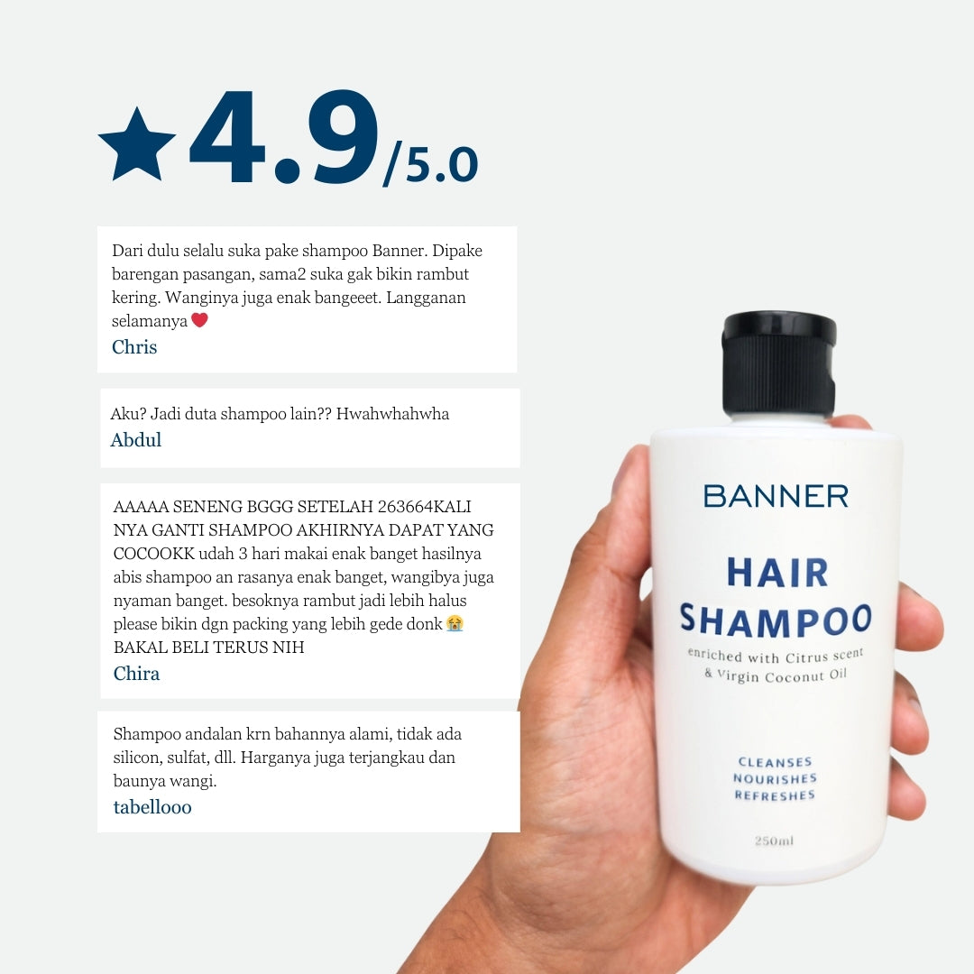 Rambut bersih bebas ketombe dengan Hair Shampoo dari Banner. Diperkaya 100% virgin coconut oil (VCO) organik yang sangat baik untuk membunuh bakteri dan kuman, menjaga kelembaban rambut, dan mengendalikan ketombe. Tidak hanya membersihkan rambut tetapi juga menjaga kesehatan kulit kepala.